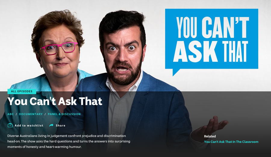 To learn more about difference in Australia and hear stories directly from diverse Australians, watch the ABC show You can’t ask that, which showcases people confronting prejudice and discrimination head-on. The show asks hard questions and turns the answers into surprising moments of honesty and heartwarming humour, helping educate the community on topics people may be anxious to talk about.