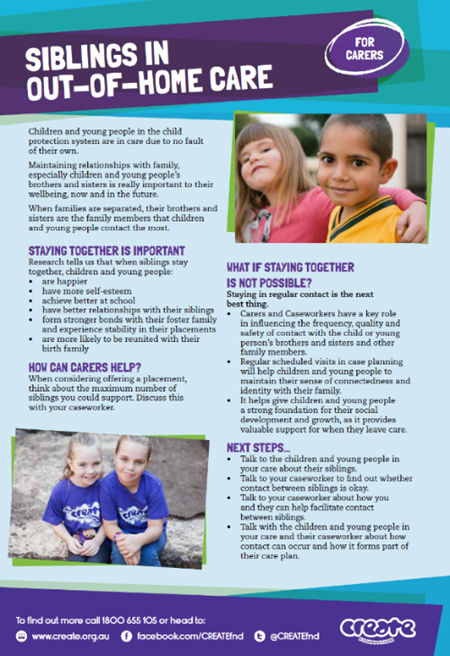 For more information on sibling contact, the carer’s role and factors to consider, see the resource from the CREATE and watch this short video on sibling contact.