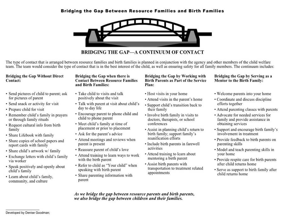 Goodman (cited DCCSDS 2015) suggests some other ways carers can partner with parents to support and promote lifelong relationships between children and their family members: