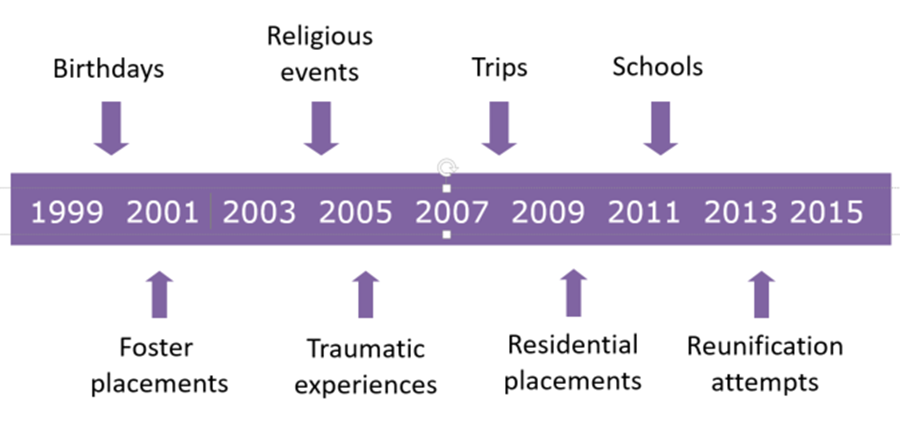 Using timelines is another technique for identifying significant people in a child’s life. This strategy may help identify pockets of people who have cared about the child at different times in their life.
