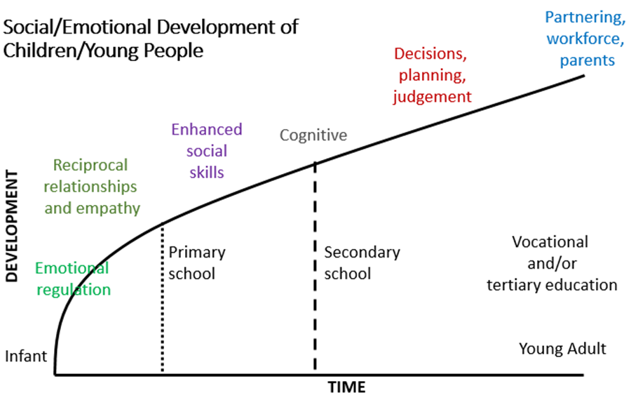 The following diagram shows the social/emotional development of children and young people without trauma. When trauma has been experienced, this trajectory may slow down, hit roadblocks, regress or accelerate in areas.
