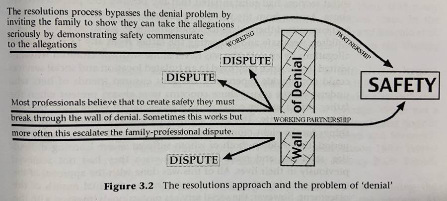 The Resolutions Approach taken by Turnell and Essex addresses the problem of “denial” by taking a position that the family and Child Safety can operate from different sources of truth, so long as there is agreement that the future safety of the children is a shared goal. (Turnell and Essex, 2006)