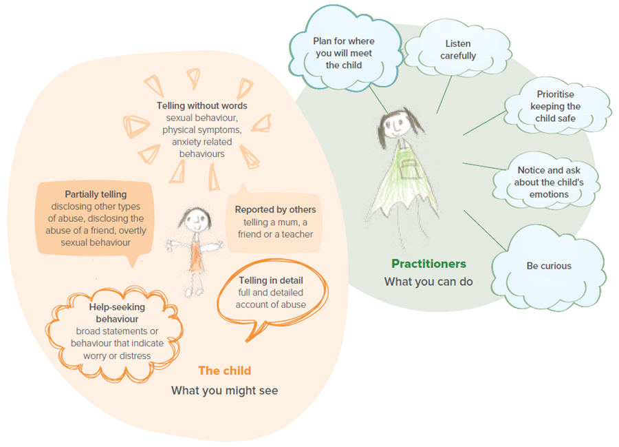 The following diagram provides a summary of the different ways a child may try to tell practitioners about their abuse, as well as how to support the child to speak out. There is further detail in the remainder of this part.