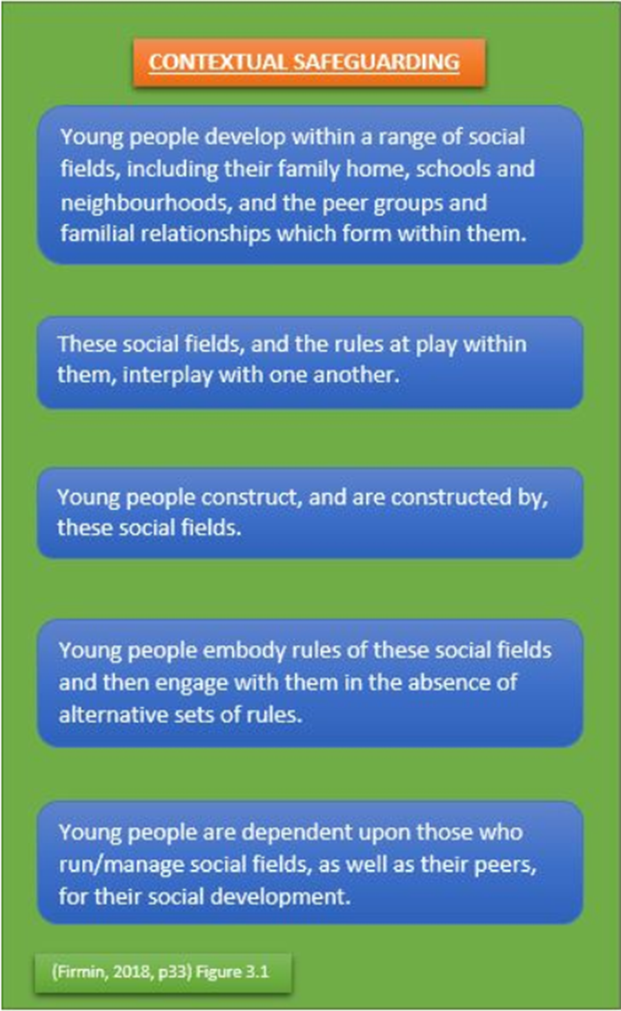 A group of researchers from the University of Bedfordshire developed strategies in order to keep young people safer within the environment they are in. They have called their approach Contextual Safeguarding (Firmin, 2018). Contextual safeguarding is an approach to understanding, and responding to, young people’s experiences of significant harm beyond their families. It recognises that the different relationships that young people form in their neighbourhoods, schools and online can feature violence and abuse. Parents and carers have little influence over these contexts, and young people’s experiences of extra-familial abuse can undermine parent-child relationships.
