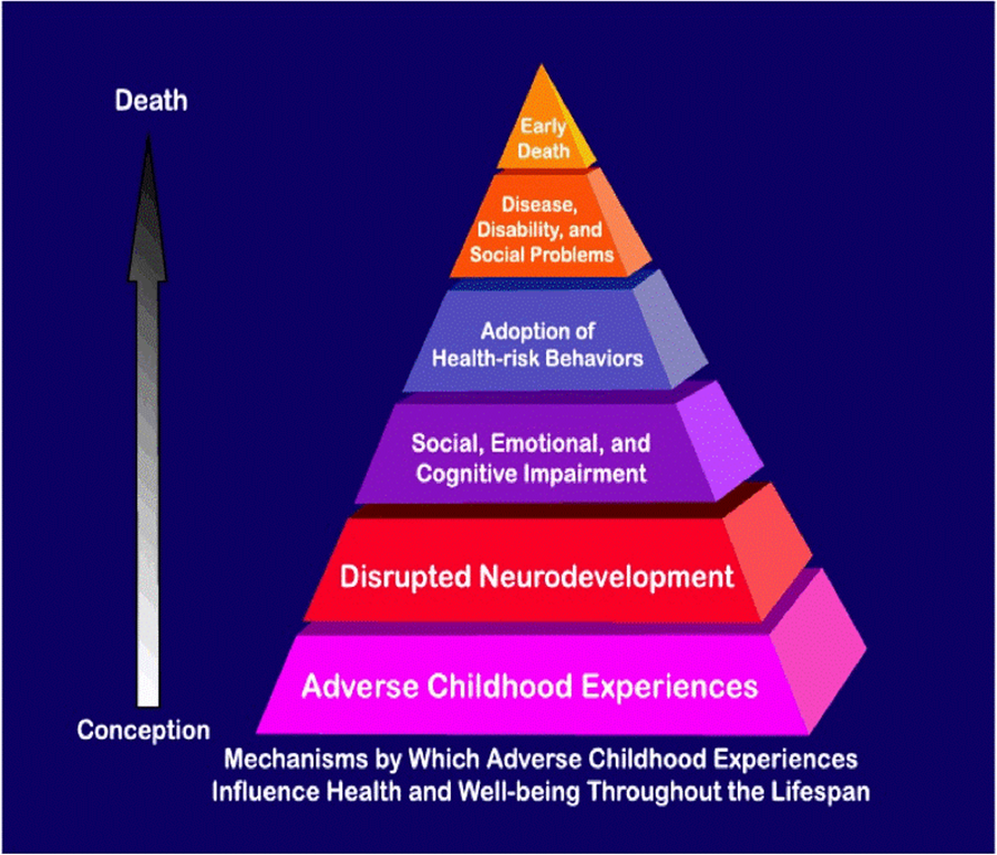 The ACE study Relationship of Childhood Abuse and Household Dysfunction to Many of the Leading Causes of Death in Adults: The Adverse Childhood Experiences (ACE) Study, was first published in 1998. At that time, the study was completed with over 9,000 adults where their adverse childhood experiences (including but not limited to the person experiencing psychological abuse, sexual abuse, living with household members who use substances / were mentally ill) were compared to measures of adult risk behaviour, health status and disease. At the time, the study “found a strong graded relationship between the breadth of exposure to abuse or household dysfunction during childhood and multiple risk factors for several of the leading causes of death in adults” (Felitti et al., 1998). The below diagram shows how ACEs influence health and wellbeing over the lifespan.