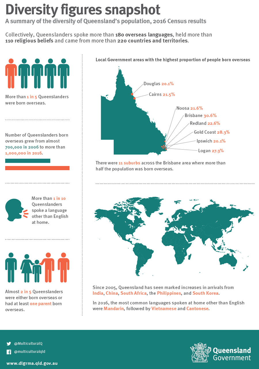 In 2016, Queenslanders spoke more than 180 languages, held more than 110 religious beliefs and came from more than 220 countries (The State of Queensland, 2016). The following figure provides an overview of the diversity of Queensland’s population as of the 2016 census: