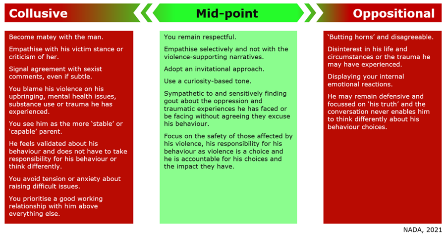 When colluding Whilst being empathetic to his feelings of victimhood, spending the time exploring his past can overly validate his feelings of trauma or substance misuse and fail to address the impact his behaviour is having on the mother and child. |
