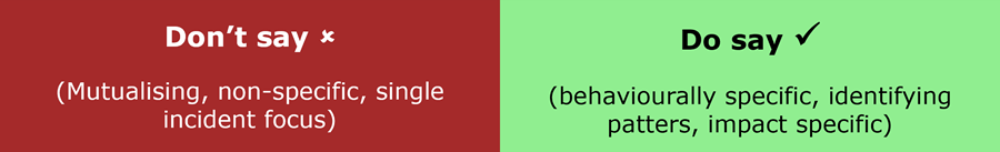 - Use behaviourally specific descriptions which reflect the deliberate and patterned nature of violence and abuse as observed or reported.