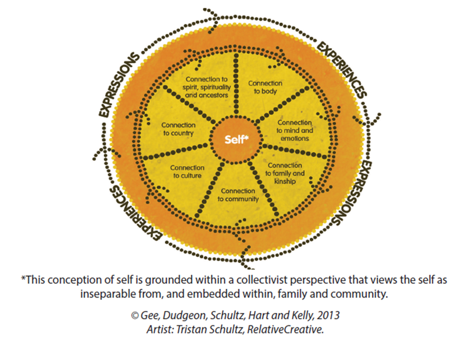 Social and emotional wellbeing for Aboriginal and Torres Strait Islander peoples is a multidimensional concept of health that includes, but extends beyond conventional (Western) views of mental health and mental illness. It expands to embrace connection to body, mind and emotions, country, culture, spirituality, ancestry, family and community as essential to social and emotional wellbeing.