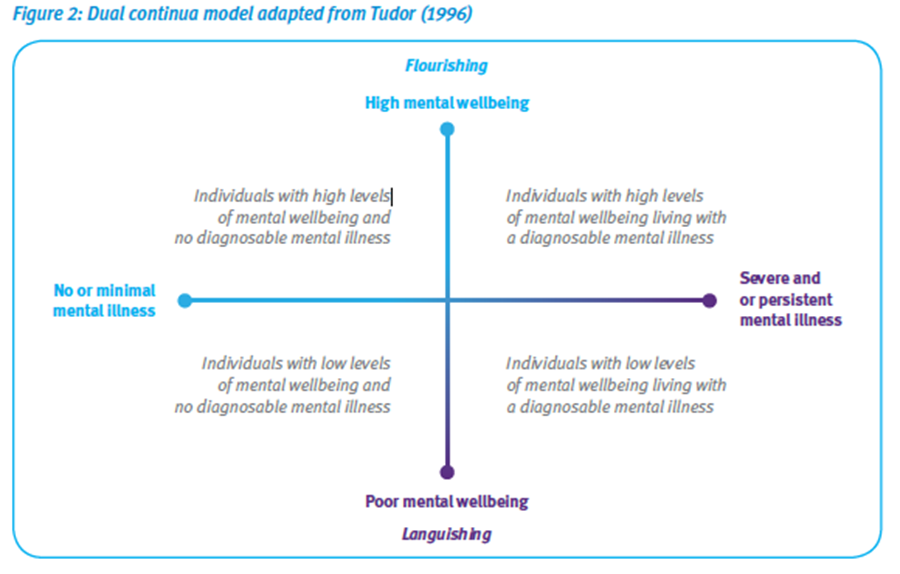 The dual continuum provides a contemporary view of mental health and wellbeing, showing that mental health and mental illness are separate and distinct concepts. In this model, mental health is conceptualised as positive feelings and positive functioning. High mental health can be thought of as ‘flourishing’. Mental health and wellbeing is an asset that can be cultivated and developed.