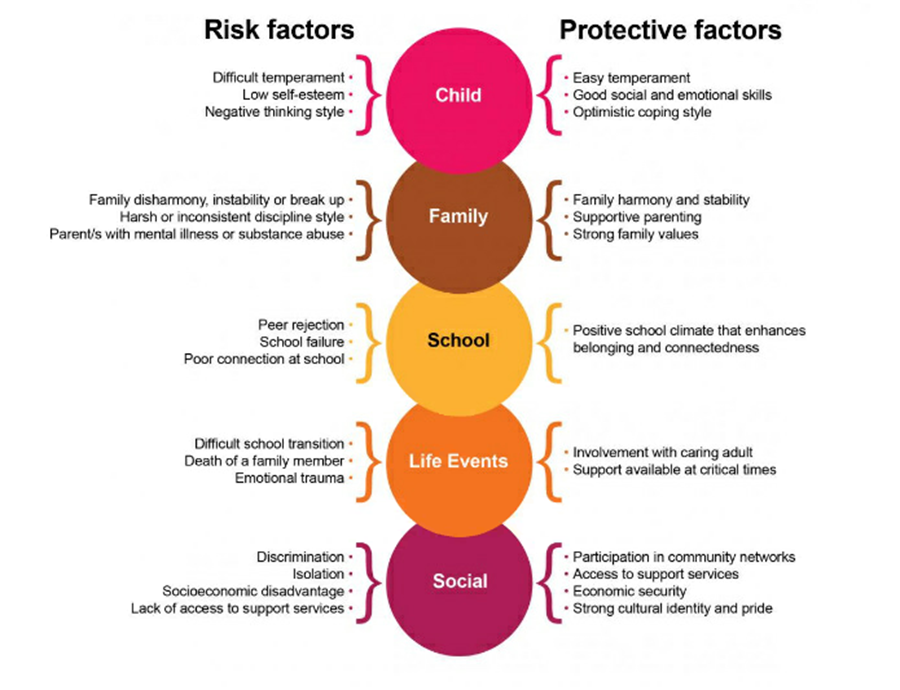 It is important to put a child’s mental health issues in the context of what else is happening. Consider the risk and protective factors for childhood mental health issues in the diagram below. The more risk factors present, the more likely the child will develop a mental health issue.