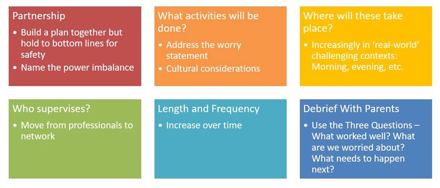 Take every opportunity to reinforce with parents the importance of spending time with their child. Let them know their child needs to see them being proactive in their efforts to change their behaviour and trust that this will help to bring the family back together again. Family time is a good opportunity for parents to practice and demonstrate knowledge and skills that work towards achieving their safety goals. Support parents to set realistic expectations and acknowledge that there will be mistakes along the way. Put mistakes in the context of learning and take the opportunity to positively influence their parenting behaviour. Consider that a therapeutic focus to this time can support connections, nurture attachment and maintain relationships (Farmer, 2018; Wilkins and Farmer, 2015).