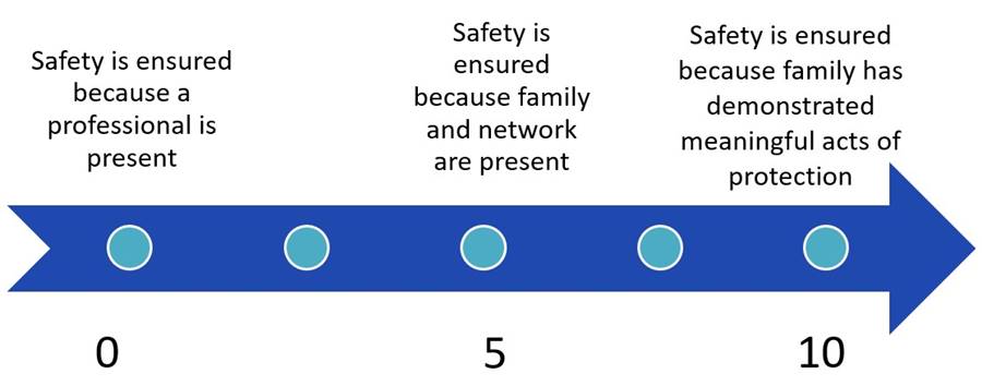 Family time seeks to balance three key needs – for a child to be safe, for family connections to be maintained and for parents to have the opportunity to safely practice and demonstrate protection and appropriate responses to risk. To gain the most out of connection time, try using this scale to help parents see where things are now, where they need to be and how the safety and support network can provide support and build safety:
