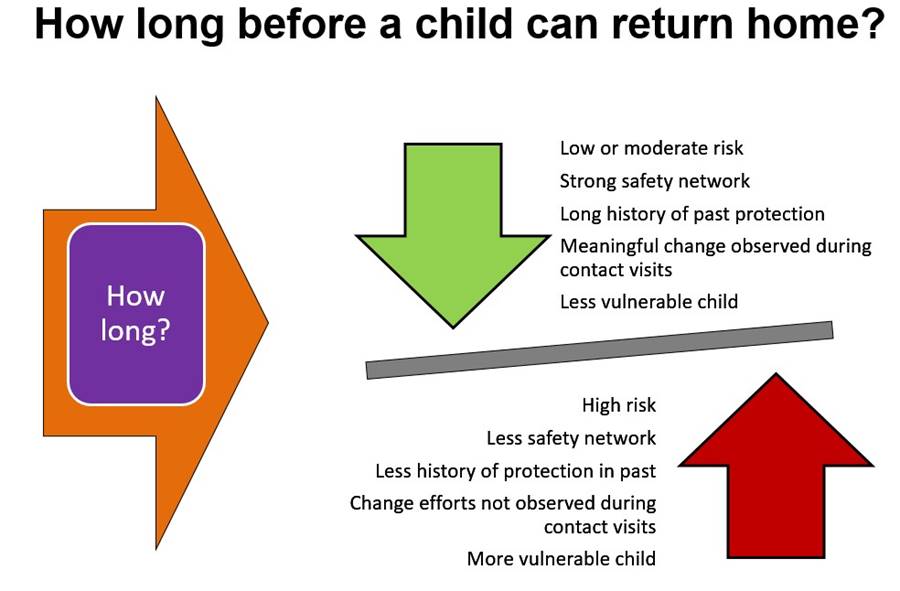 Decisions aren’t made at one point in time of a child protection intervention. Multiple decisions are made every day at every phase and are more often than not influenced by many factors and complexities. When working towards reunification, practitioners can often struggle with knowing how long it can be before it is safe for a child to return home. The following graphic outlines some of the elements of risk and safety that must be balanced to inform decision making. Is there anything else that needs consideration?