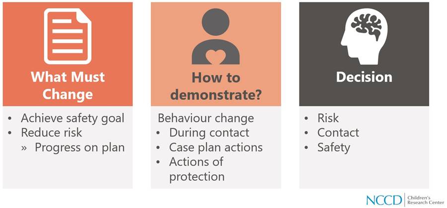 As discussed, honest and transparent conversations will help to build strong relationships with a child and family to partner with them around key decisions about reunification and alternative plans for permanency. When working towards reunifying a child to the care of their parents, there are three things that need to be clear from day 1 – what needs to change, how this change can be demonstrated and the need for a clear decision based on risk, contact and safety.