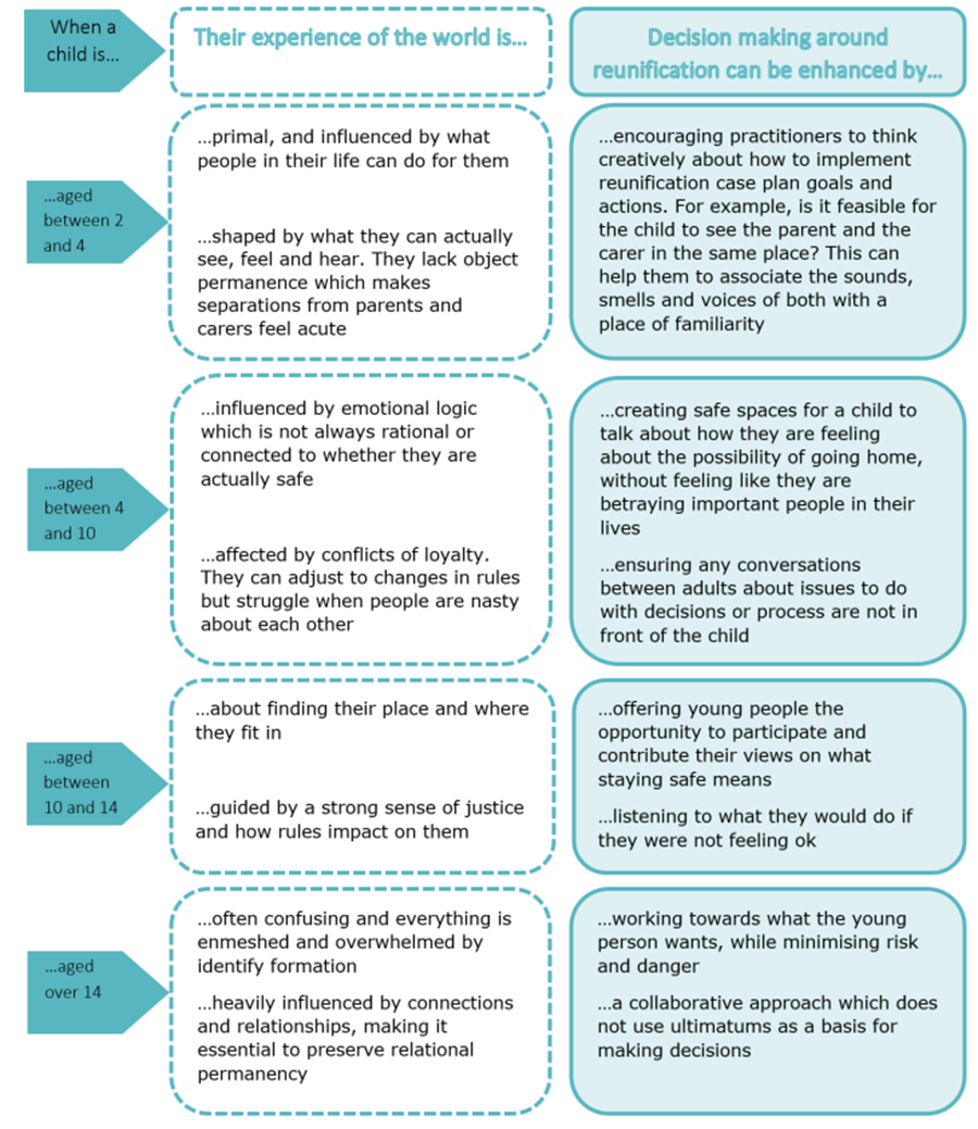 Knowledge and understanding of child development can provide a lens through which to see reunification, and decisions around this, through the eyes of the child.
