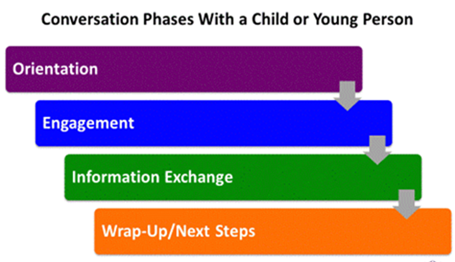 The engagement phase gives the child space to become comfortable with you and the conversation. At this stage, gather information about how the child is feeling on that day so you can tailor your communication. It is good to gain an understanding of the child. They may be anxious and not want to engage for long periods. Ask the child to tell you a story about a holiday or school trip.