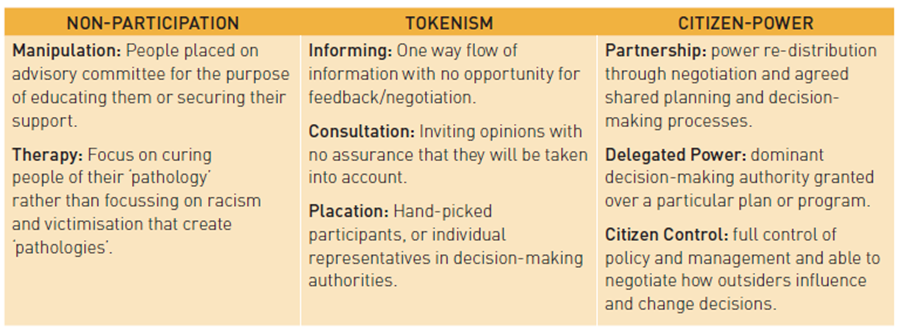 Arnstein’s (1969) participation continuum (below) shows how ‘Genuine partnership requires more than consultation and tokenistic efforts … it requires a shift in the power dynamics’ (SNAICC, 2019).