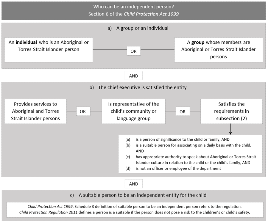 - Section 11A ‘Who is an independent Aboriginal or Torres Strait Islander entity?’ outlines who can be an ‘independent Aboriginal or Torres Strait Islander entity for a child’.