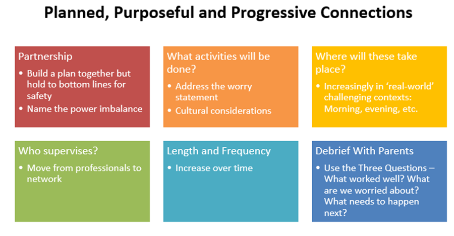 Parents and other family members may benefit from a coaching approach to help them re-establish relationships and roles. Consider the following four visit coaching principles to help guide your practice in rebuilding and reconnecting young people with their family.